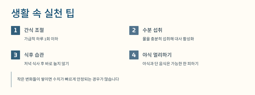 밥·빵·면을 한 끼에 과하게 먹는 습관을 줄이면 수치가 눈에 띄게 내려갑니다.