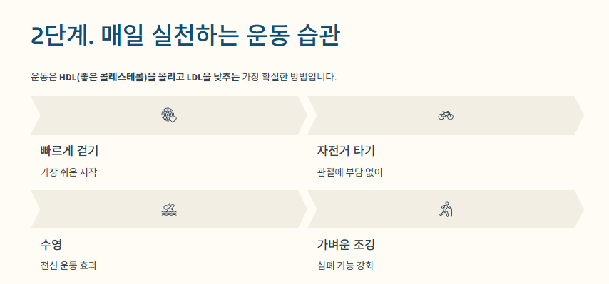운동은 HDL(좋은 콜레스테롤)을 올리고 LDL을 낮추는 가장 확실한 방법입니다.