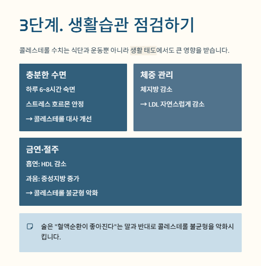 콜레스테롤 수치는 식단과 운동뿐 아니라 생활 태도에서도 큰 영향을 받습니다.