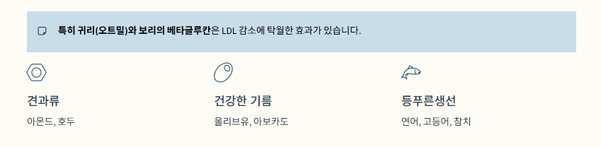특히 귀리(오트밀)와 보리의 베타글루칸은 LDL 감소에 탁월합니다.
