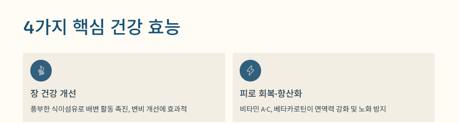 - 장 건강, 항산화, 빈혈 예방, 피로 회복에 도움