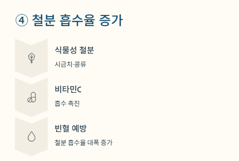 시금치·콩류 같은 식물성 철분 음식과 함께 섭취하면 흡수율이 크게 올라갑니다.