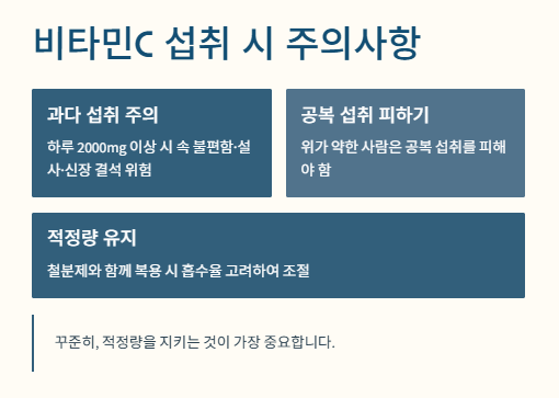 - 하루 2000mg 이상 과다 섭취 시 속 불편함·설사·신장 결석 위험