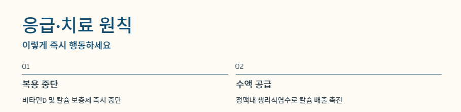 - 응급치료: 복용 중단, 수액, 이뇨제, 약물(비스포스포네이트·스테로이드 등), 심한 경우 투석.