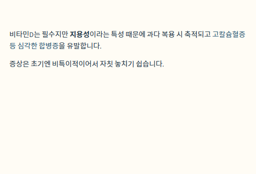 - 비타민D는 지용성 비타민입니다. 체내에 축적되기 쉽고, 과하면 혈중 칼슘을 과다하게 높입니다(고칼슘혈증).