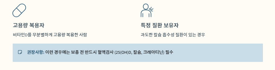 이런 경우에는 보충 전 반드시 혈액검사(25(OH)D, 칼슘, 크레아티닌)를 권장합니다.