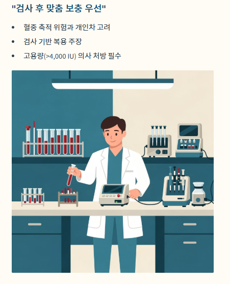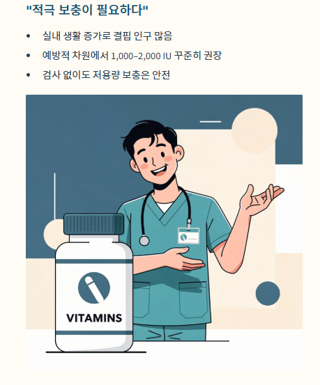 - 예방적 차원에서 1,000–2,000 IU를 꾸준히 권장.