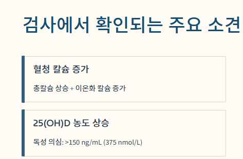 - 혈중 25(OH)D 농도 상승 — 보통 독성 의심은 >150 ng/mL(375 nmol/L) 또는 장기 고용량 복용 병력과 함께 판단.