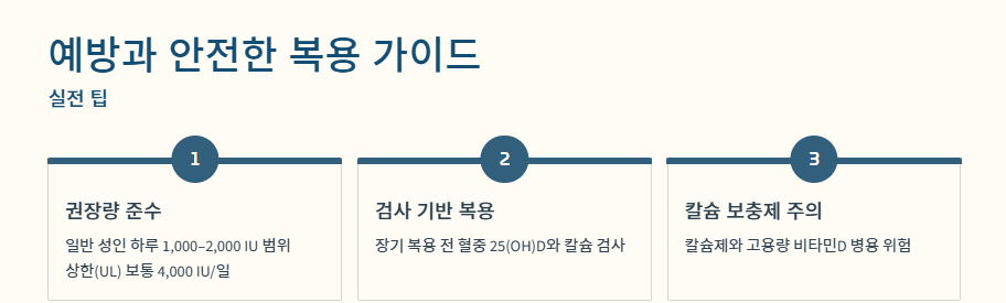 - 예방: 권장량 준수(대개 1,000–2,000 IU/일), 상한 4,000 IU/일, 검사 기반 복용 권장.