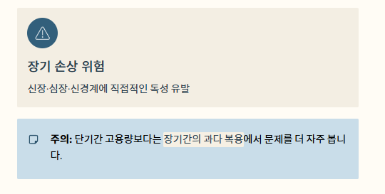 - 단기간 고용량보다는 장기간의 과다 복용에서 문제를 더 자주 봅니다.