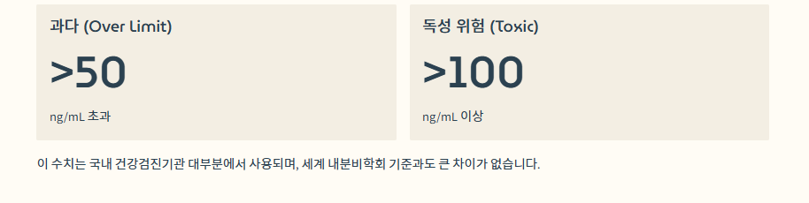 - 독성 위험(Toxic): 100 ng/mL 이상