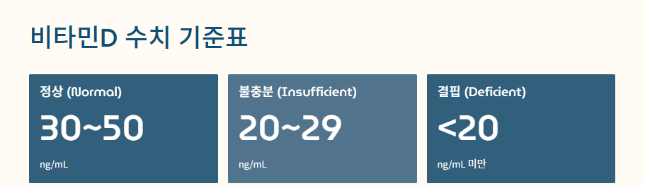 - 비타민D 정상 수치는 30~50 ng/mL
