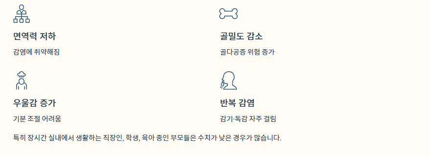 특히 장시간 실내에서 생활하는 직장인, 학생, 육아 중인 부모들은 수치가 낮은 경우가 많습니다.