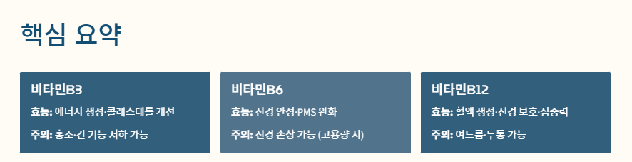 - B6: 신경 안정·PMS 완화 / 과다 시 신경 손상 가능