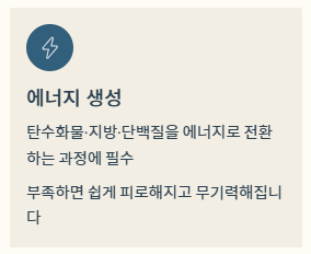 영양소를 에너지로 바꾸는 대사 과정에 직접 관여해 피로 개선에 도움이 됩니다.