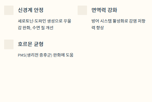 세로토닌, 도파민 등 신경전달물질 생성에 관여해 우울감 완화, 수면 질 개선에 도움을 줍니다.