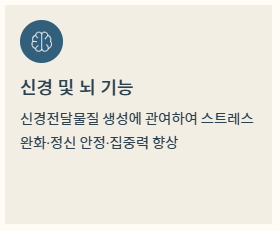 신경전달 물질 생성에 관여하여 스트레스 완화, 정신적 안정, 집중력 향상에 도움을 줍니다.
