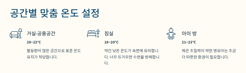 - 침실은 조금 낮게, 영유아 방은 조금 더 높게 조절