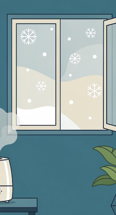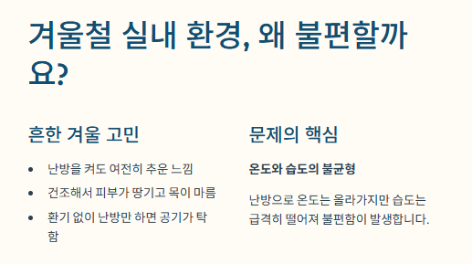 겨울철에는 난방 사용이 늘어나면서 온도는 올라가지만, 실내 습도가 급격하게 떨어집니다. 반대로 환기 없이 난방만 하면 공기가 탁해지고 건강에도 영향이 생기죠.