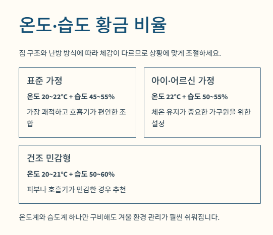 적정 온도와 습도는 숫자로 제시되지만, 집 구조나 난방 방식에 따라 체감 차이가 큽니다.