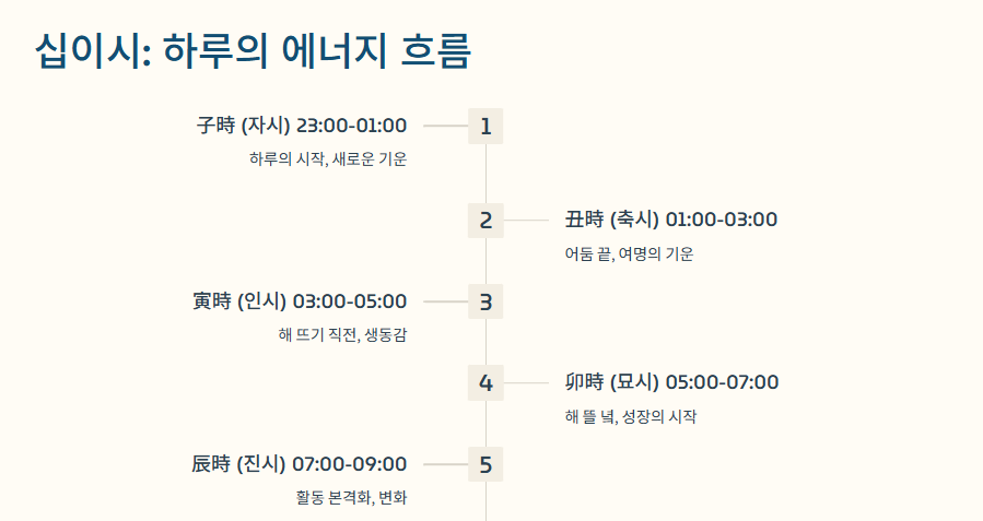 - 子時 (자시): 밤 11시 ~ 새벽 1시 (하루의 시작)
