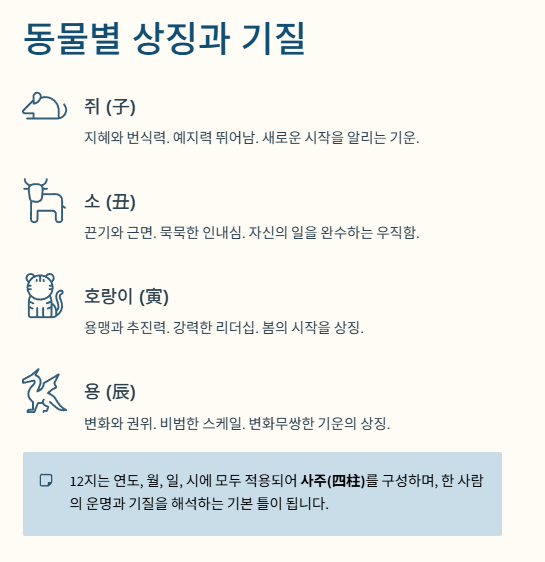 각 지지에 배정된 12마리 동물은 단순히 상징을 넘어, 해당 지지(地支)의 기운과 성질을 대변합니다.