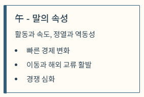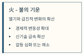| 火 (불 기운의 과도함) | 열기, 급진적 변화, 확산, 명예 | 경제적 변동성 확대, 새로운 기술/아이디어 급속 확산, 갈등의 심화 또는 해소 |