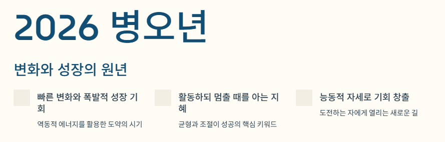 2026년 병오년은 60년 만에 오는 강력한 에너지의 해입니다. 하늘과 땅이 모두 '양(陽)의 불' 기운으로 가득 차 있어, 우리 사회와 개인에게 빠른 변화와 폭발적인 성장 기회를 제공할 것입니다.