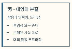 | 丙 (태양) | 밝음, 명확함, 드러남 | 투명성 요구 증대, 은폐되었던 사실이나 비밀 폭로, 대외적 활동 두드러짐 |
