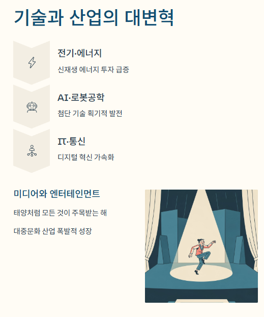 - 미디어와 대중의 집중: 태양(丙火)처럼 모든 것이 드러나고 주목받는 해이므로, 미디어, 엔터테인먼트, 대중문화 산업이 폭발적인 인기를 얻을 가능성이 높습니다.