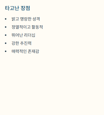 - 장점: 매우 밝고 명랑하며, 정열적이고 활동적입니다. 리더십이 뛰어나고 자신의 목표를 향해 돌진하는 추진력을 가집니다. 사람들의 시선을 끄는 매력이 있습니다.