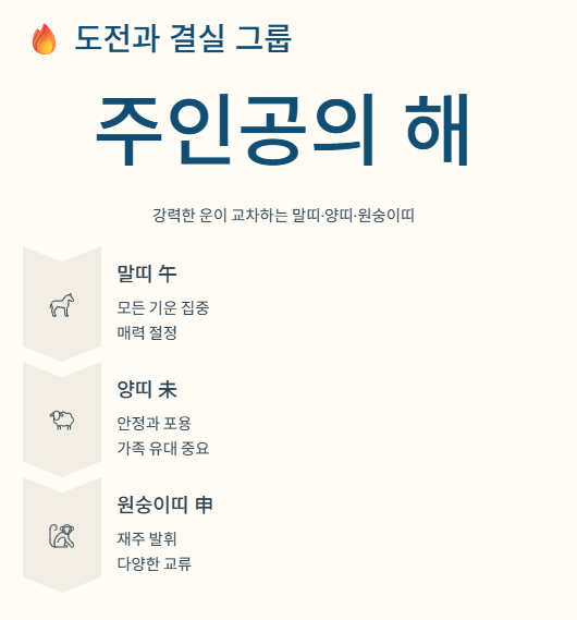 강력한 운이 교차하며 도전과 결실이 동시에 따르는 그룹입니다. 특히 말띠는 병오년의 주인공입니다.