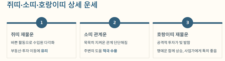 | 호랑이띠 (寅) | 추진력 폭발 | 재물운: 목표를 향한 공격적인 투자가 빛을 발합니다. 명예운이 함께 들어와 사업가에게 특히 좋습니다. 관계운: 리더십이 주목받으며 주변을 이끄는 위치에 섭니다. |
