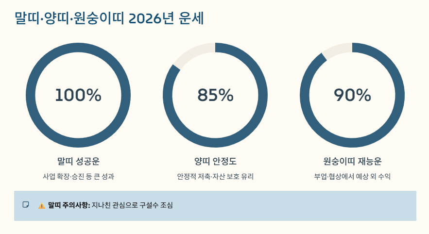 | 돼지띠 (亥) | 복과 지혜 | 재물운: 큰 욕심을 부리지 않으면 안정적인 흐름을 유지합니다. 작은 복이 꾸준히 들어오는 해입니다. 관계운: 내면의 지혜가 빛을 발하여 복잡한 인간관계를 현명하게 풀어갑니다. |