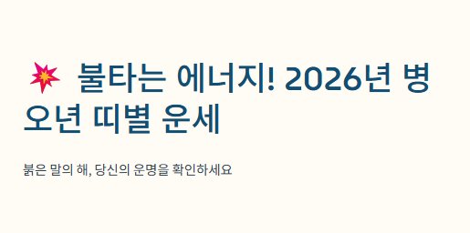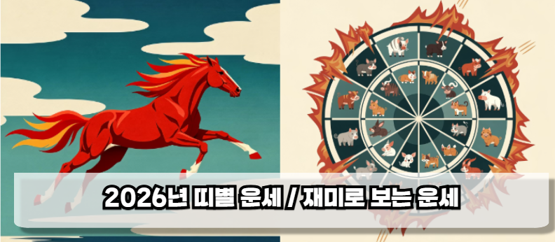 매년 새로운 기운이 찾아오면, 우리는 그 해의 운세에 대해 궁금증을 가지게 됩니다. 특히 2026년은 하늘과 땅이 모두 '강력한 불(火)' 기운으로 가득 찬 병오년(丙午年), 바로 붉은 말의 해입니다. 이처럼 폭발적인 에너지가 12가지 띠에게 어떤 행운과 도전을 가져다줄까요?