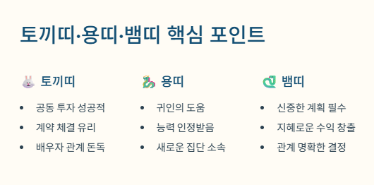 | 토끼띠 (卯) | 협력과 번영 | 재물운: 주변과의 협력을 통해 공동 투자가 성공적입니다. 문서운과 계약운이 상승합니다. 관계운: 주변의 도움으로 어려운 문제가 해결됩니다. 연인 또는 배우자와의 관계가 더욱 돈독해집니다. |
