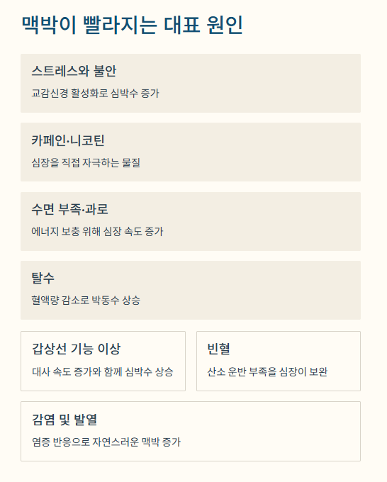맥박 증가(빈맥)는 흔한 증상이지만, 원인을 자세히 알아두면 불안함을 줄이고 적절히 대처하는 데 큰 도움이 됩니다.