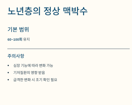 노인은 60~100회의 기본 범위를 유지하되, 심장 기능이나 다른 질환에 따라 변화가 쉽게 나타날 수 있습니다.