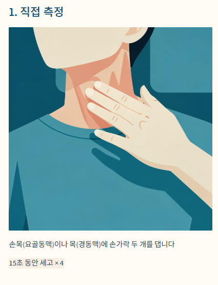손목(요골동맥)이나 목(경동맥)에 손가락 두 개를 대고 15초 동안 뛰는 횟수를 세고, 4를 곱하면 1분 맥박수를 쉽게 계산할 수 있습니다.