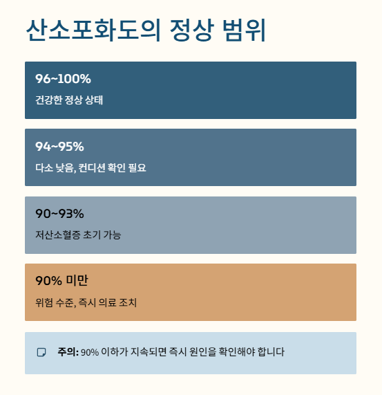 - 94~95% : 다소 낮을 수 있음, 호흡기 질환 또는 컨디션 확인 필요