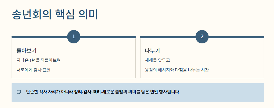 즉, 단순한 식사 자리가 아니라 정리, 감사, 격려, 새로운 출발의 의미를 담은 연말 행사입니다.