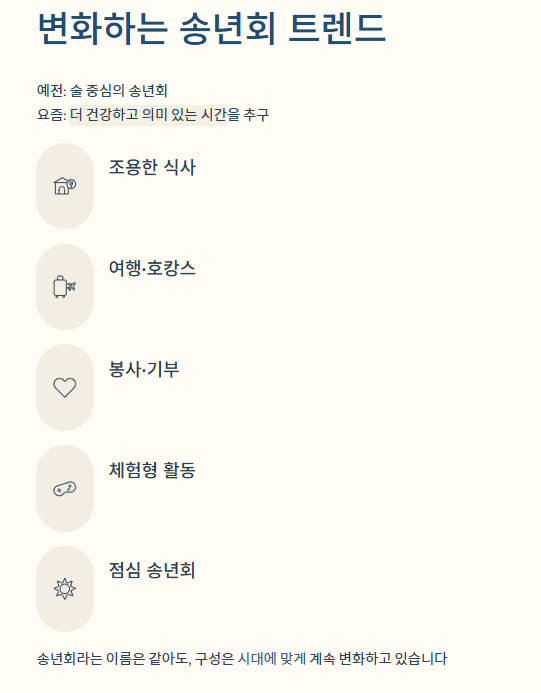 예전에는 술 중심의 송년회가 많았다면, 요즘은 **‘더 건강하고 의미 있는 시간’**을 추구하는 분위기로 바뀌고 있습니다.