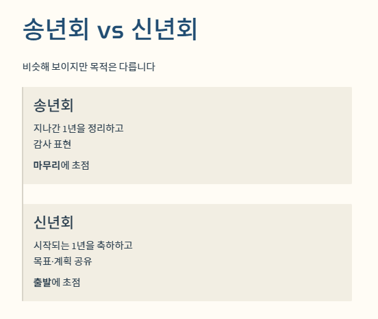 송년회는 ‘마무리’, 신년회는 ‘출발’에 초점이 있습니다.