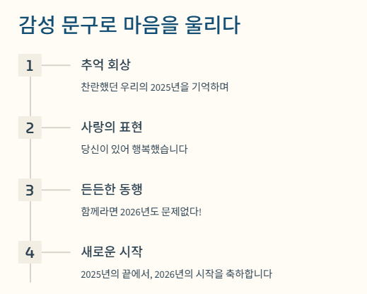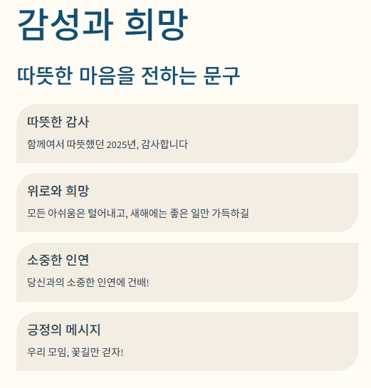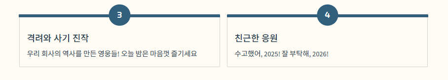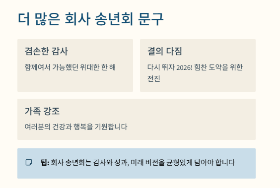 | 4 | 수고했어, 2025! 잘 부탁해, 2026! [팀/부서 이름] 화이팅! | 친근한 회사, 팀 모임 |