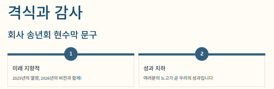 | 1 | 2025년의 열정, 2026년의 비전과 함께! [회사명] 송년의 밤 | 공식적, 미래 지향적 |