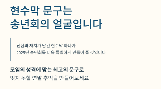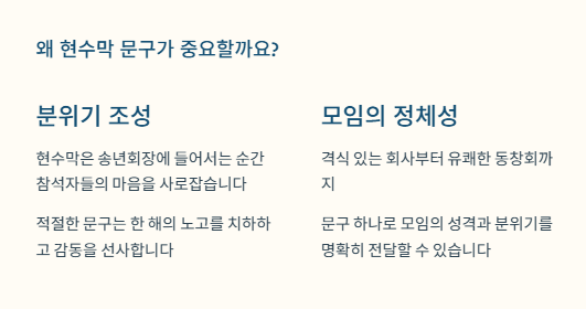송년회 현수막 문구는 참석자들에게 모임의 성격을 빠르게 전달하고 즐거운 분위기를 조성하는 가장 저렴하고 효과적인 방법입니다.