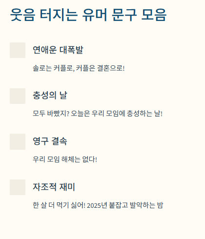 친구, 동창, 취미 모임 등 친근한 관계에서는 웃음을 유발하고 추억을 소환하는 재미있는 문구가 좋습니다.