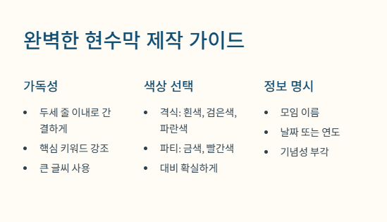 - 날짜와 장소 명시: 현수막에 **모임 이름, 날짜(혹은 연도)**를 명확히 넣어 기념성을 높이는 것이 좋습니다.