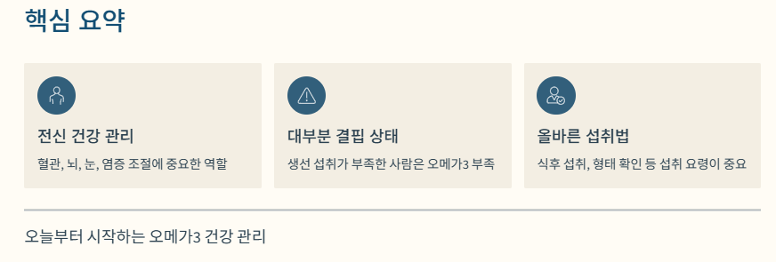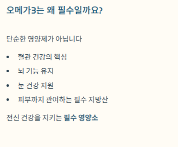 - 오메가3는 혈관, 뇌, 눈, 염증 조절에 중요한 역할