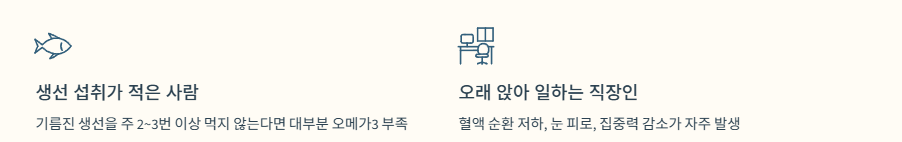 기름진 생선을 주 2~3번 이상 먹지 않는다면 대부분 오메가3가 부족한 편입니다.